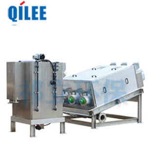 調(diào)理好的污泥進(jìn)入帶式污泥脫水機(jī)重力脫水區(qū),在布料機(jī)構(gòu)和疏料機(jī)構(gòu)的共同作用下,隨濾帶向前運(yùn)動(dòng)并在重力作用下,脫去污泥的空隙水。