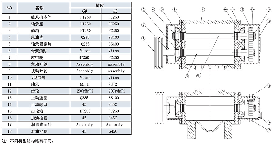 三葉羅茨鼓風(fēng)機(jī)結(jié)構(gòu)簡(jiǎn)圖: